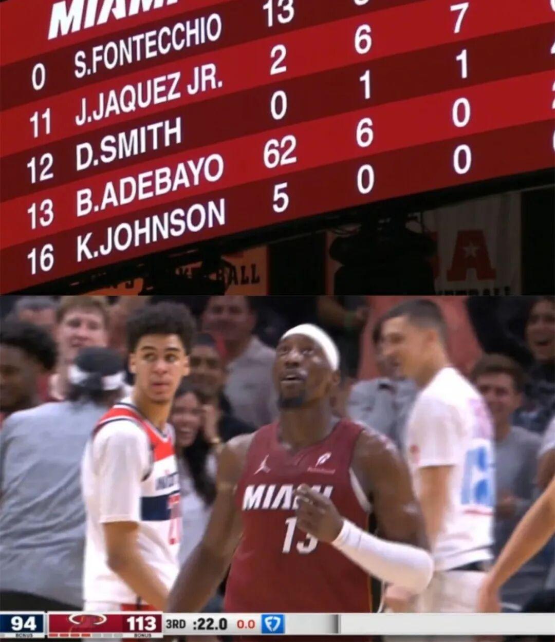 注意,此时的热火已经以113-97领先16分,如果是正常轮换的话,阿德巴约应该在第四节前半段休息,看分差比较接近再上场、分差比较大就不上场。